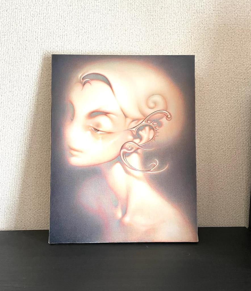 インスタグラムで一目惚れした絵だったので、手に入れることができて本当に嬉しかったです。顔の角度や妖艶な瞳と唇が本当に素敵です。絵を手にした時、ふわっと絵具の匂いがします。これはギャラリーでは中々味わえません。輪郭がボケている感じもお見事です。近くでみてもどのように描かれているのか全然分かりません。色んな色が複雑に絡み合って立体感を作り上げています。Hey4roさんは金属表現も得意としているので、それが耳付近にあるのも良いですね。そして今回のアートスタイルとして一番特徴的なのが透明な瞼。「WISDOM」は他の絵と比べて瞳が少し小さいのが好きポイントです。今回人生で初めての絵画購入だったのですが、本当に良い経験をしました。(Hey4roさんからのおまけのギフト、泣きそうになりました…!)